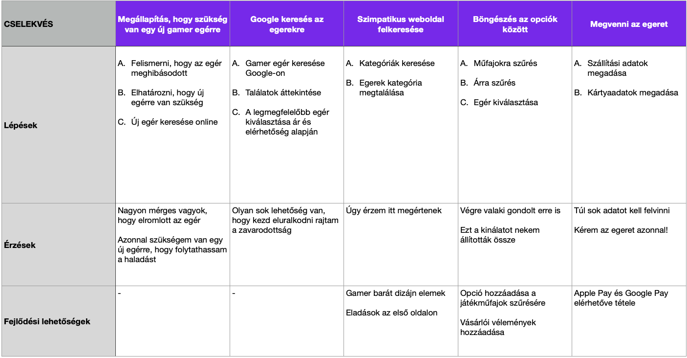 Ez az útvonal-térkép Alex vásárlási folyamatát szimulálja egy gamer egér megvásárlása során. Bemutatja az elvégzendő feladatokat, az érzéseit, valamint a lehetséges fejlesztési lehetőségeket.