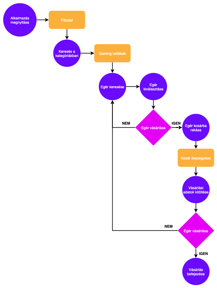 Ez a felhasználói folyamatábra bemutatja azokat a lépéseket, amelyeken a felhasználó végighalad célja eléréséhez. Ez szolgált útmutatóként a drótvázak készítése során.